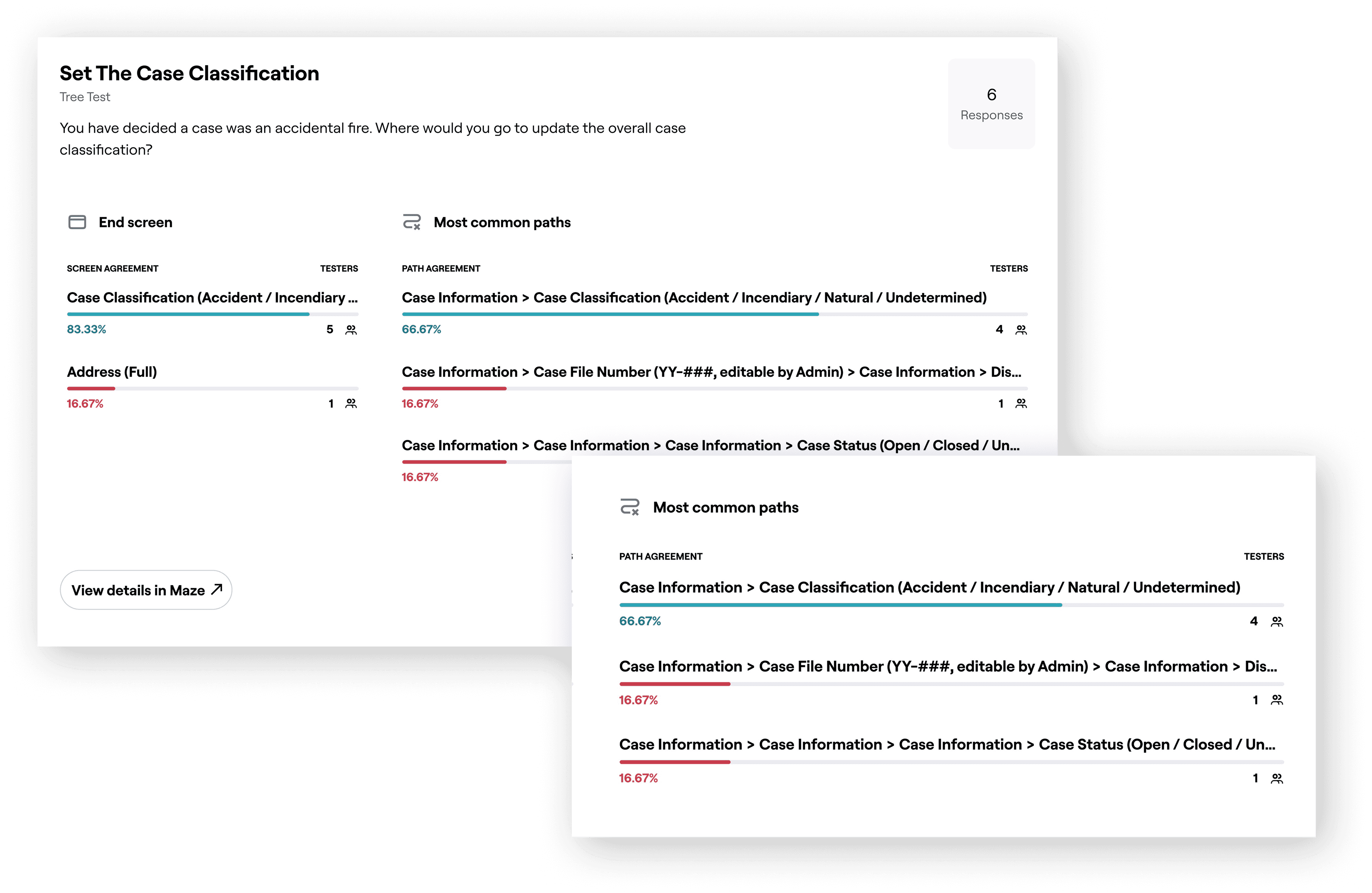 We conducted unmoderated tree tests using Maze with 7 out of 14 investigators to test if our new phase-based navigation worked.