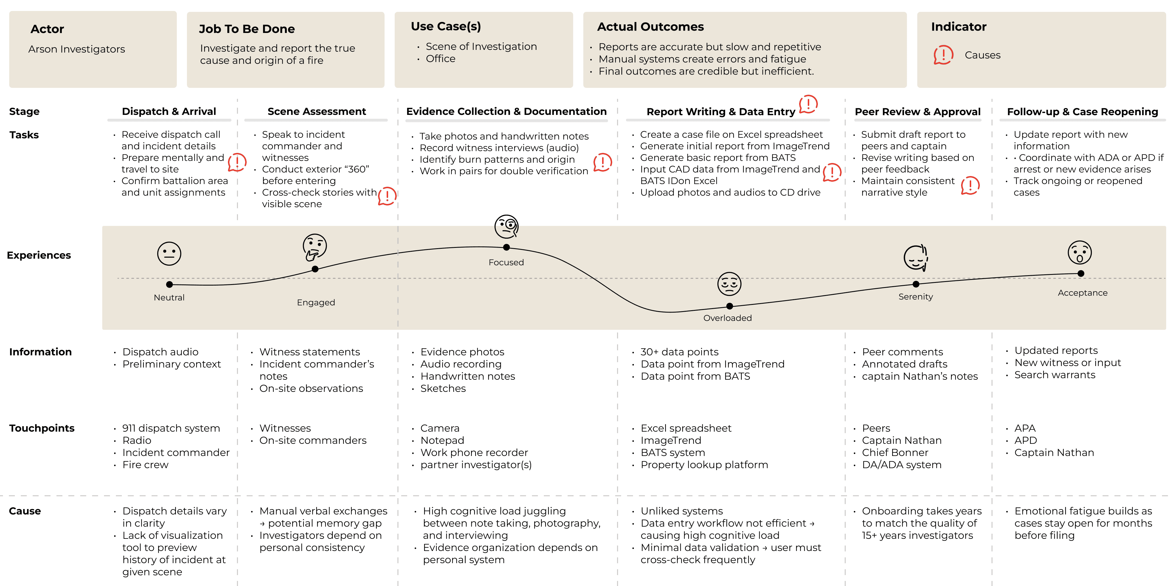 As part of the core courses at Georgia Tech's MS-HCI, we partnered with Atlanta Fire Investigation Unit, a law enforcement unit for the city of Atlanta under the Atlanta Fire-Rescue Department, that works around the clock to conduct fire origin and cause examinations for the fire service and law enforcement.